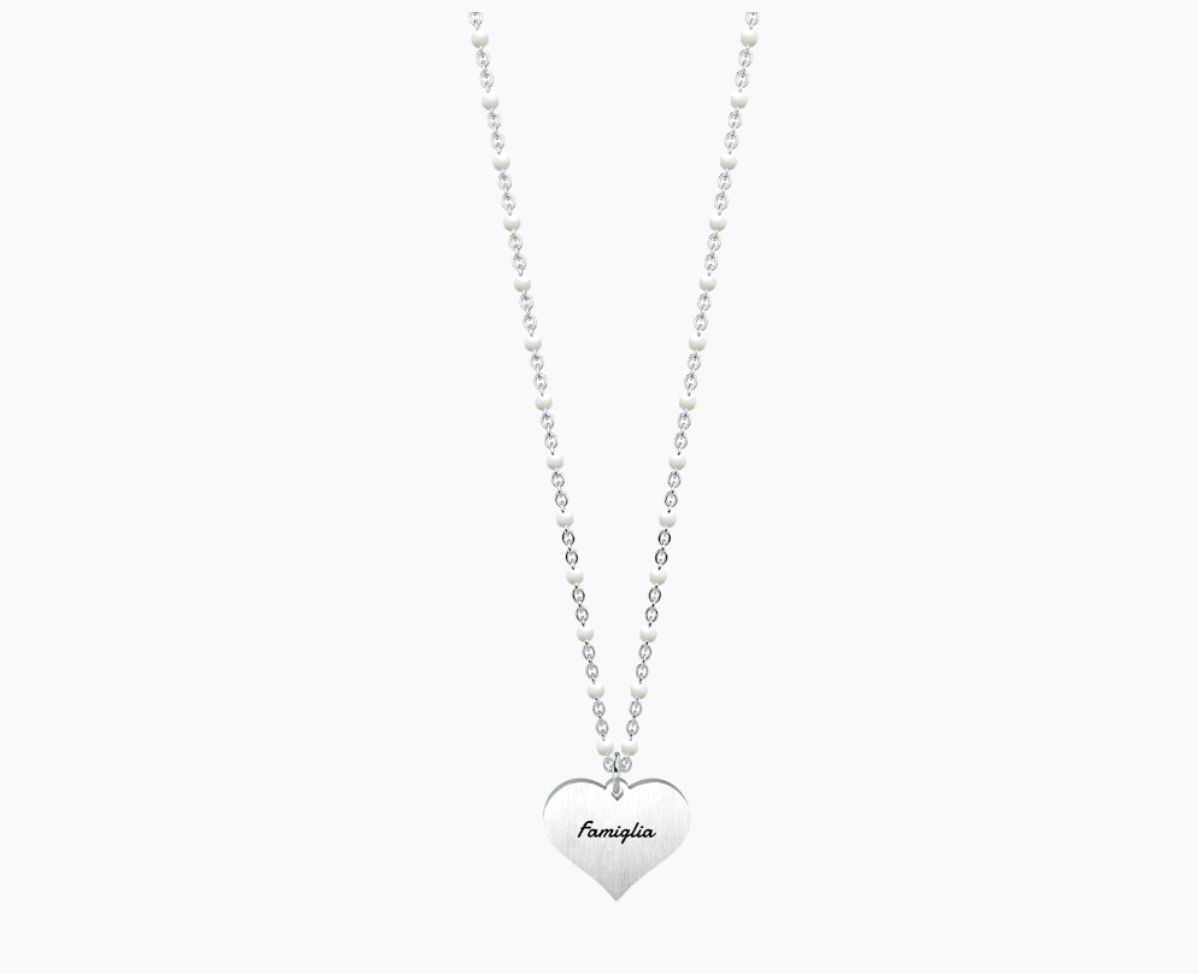 Collana corta in acciaio con ciondolo a cuore e catena rolò con inserimenti in smalto bianco.