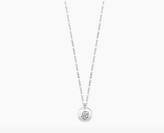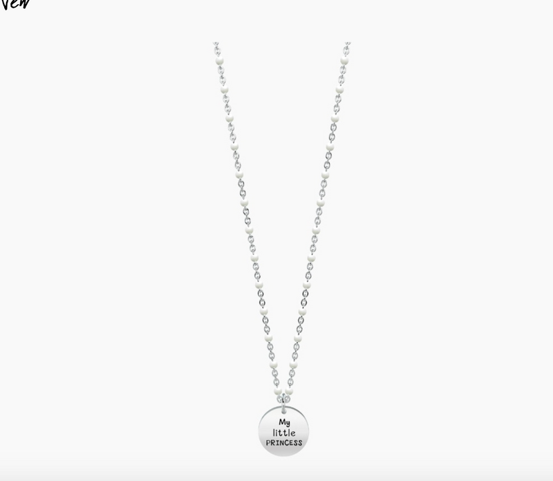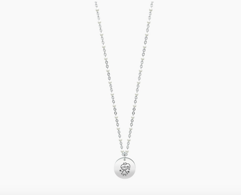 Collana corta in acciaio con ciondolo tondo e catena rolò con inserimenti in smalto bianco.