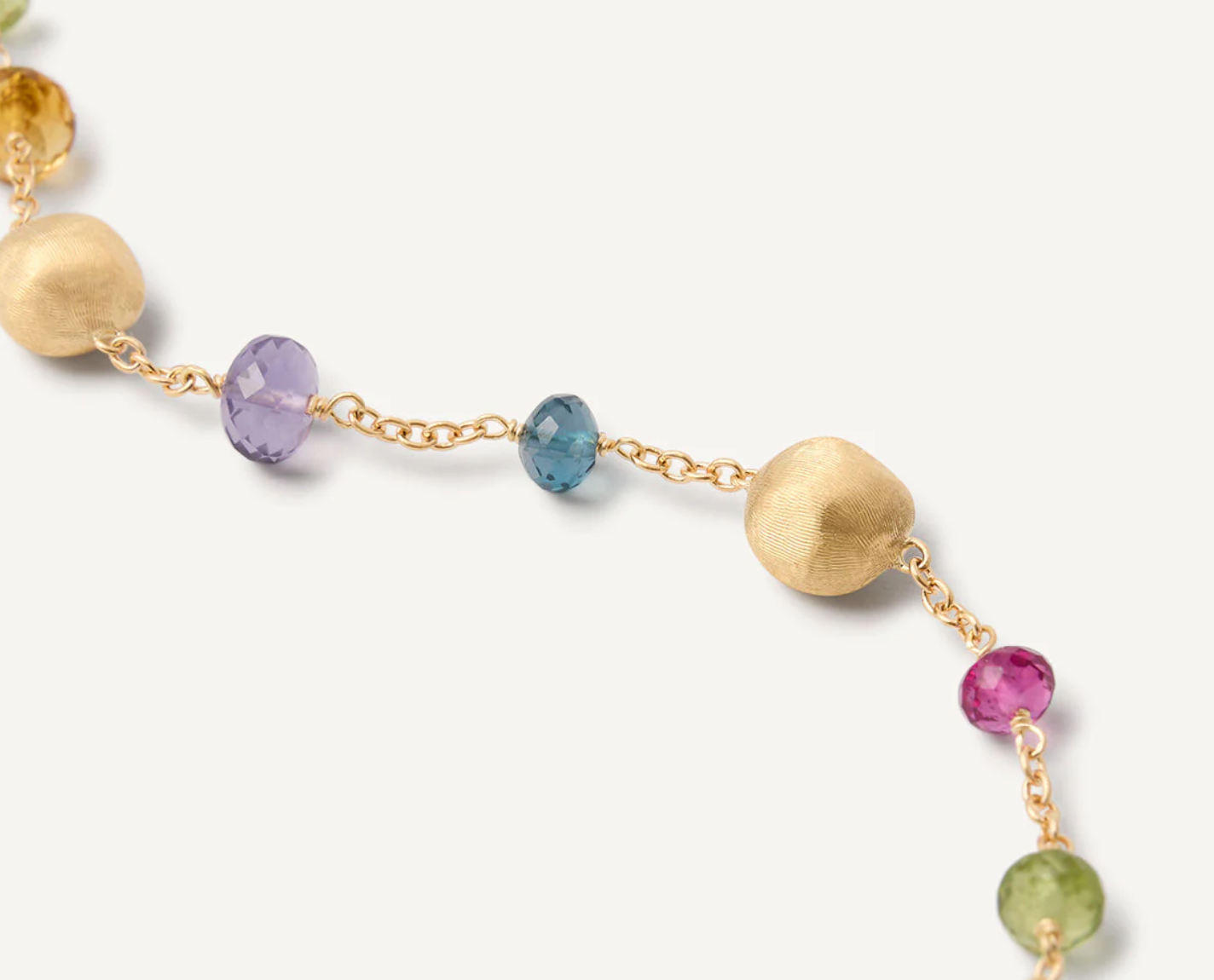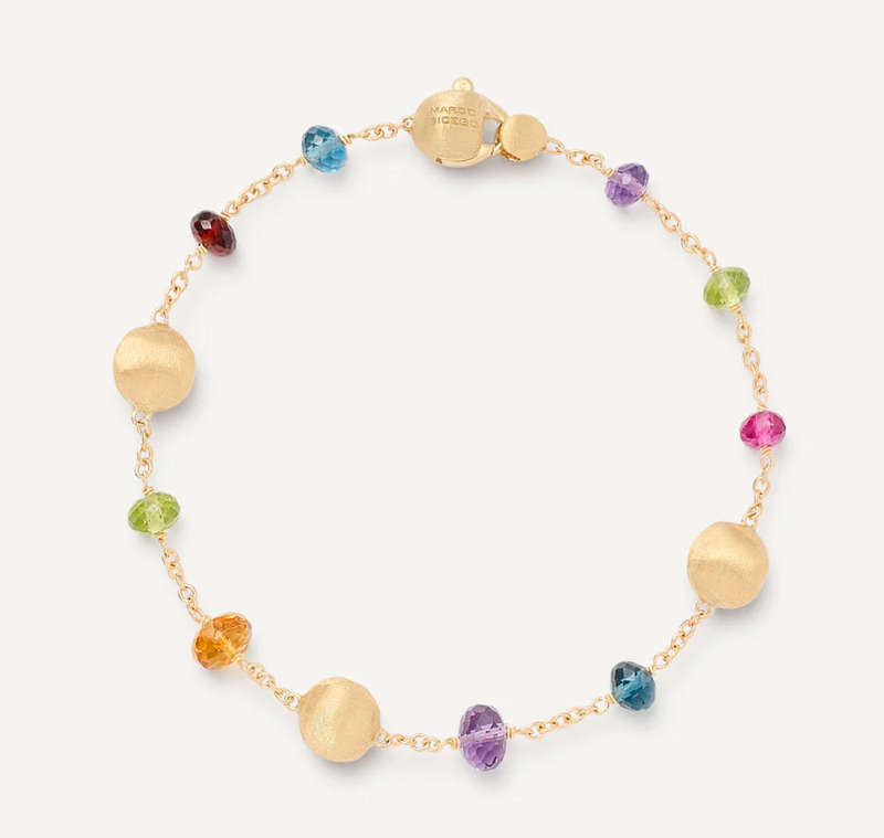 Una magnifica combinazione di gemme di diverso colore si alterna a sfere d'oro giallo 18kt, dalla superficie irregolare, finemente incise a mano con l'antica tecnica del bulino millerighe. Divertente e brioso, questo bracciale è perfetto per completare il look e dare un tocco di colore a qualsiasi outfit.