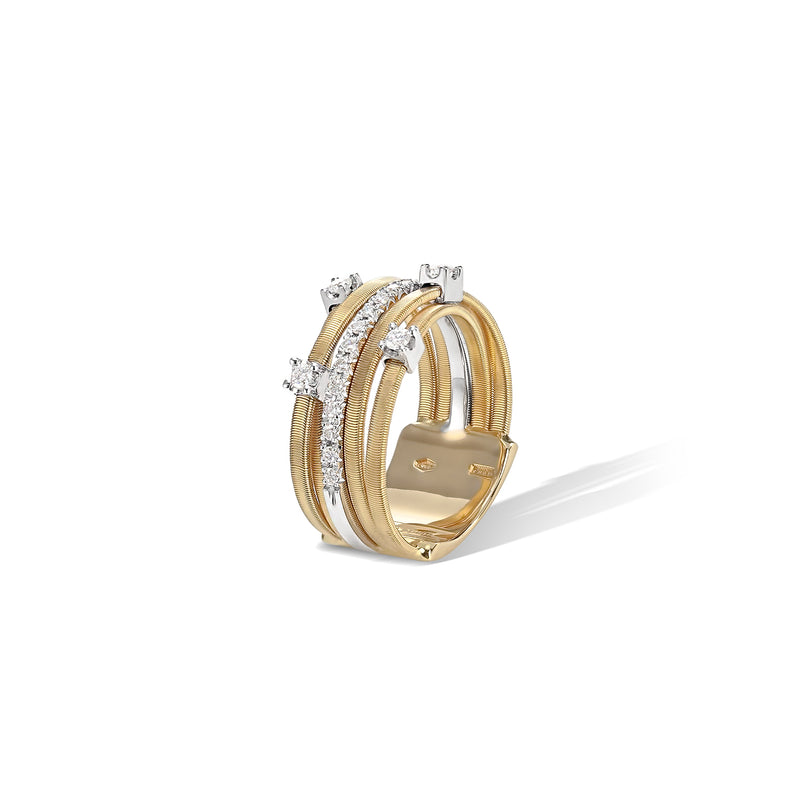 Questo sofisticato anello, in oro bianco 18kt, è impreziosito da una barretta di Diamanti intrecciata a fili di Spirali Piatte. Quattro castoni, ne incorniciano i profili, rendendolo ancor più luminoso.