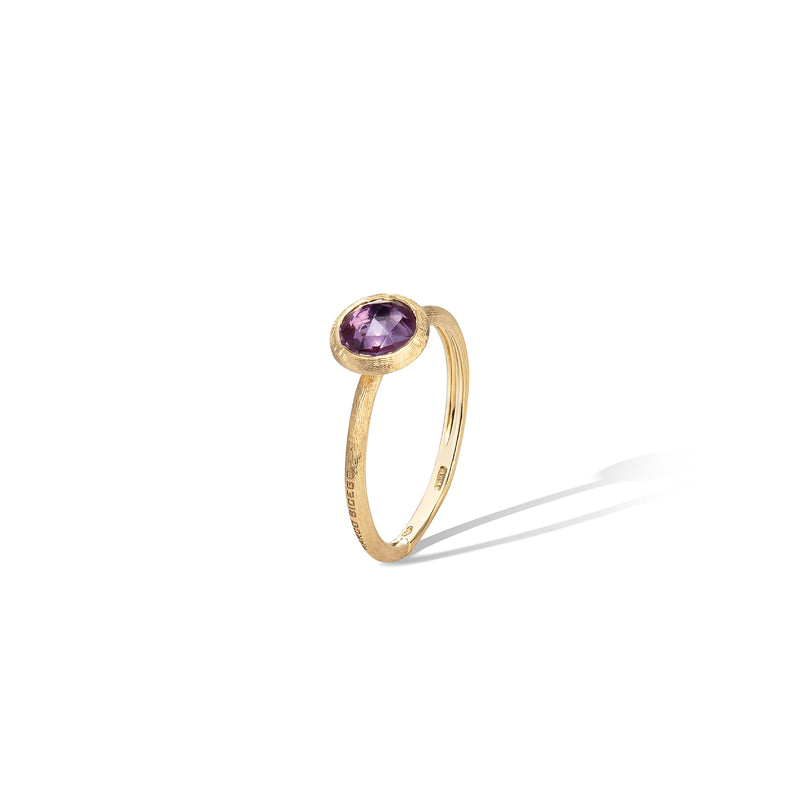 Perfetto da solo o abbinato agli altri colori della collezione, questo sofisticato anello monta un'Ametista Light accuratamente selezionata e incastonata in una ghiera di oro giallo 18kt, incisa a mano con l'antica tecnica del Bulino Millerighe. Un tocco di colore perfetto per ogni outfit.