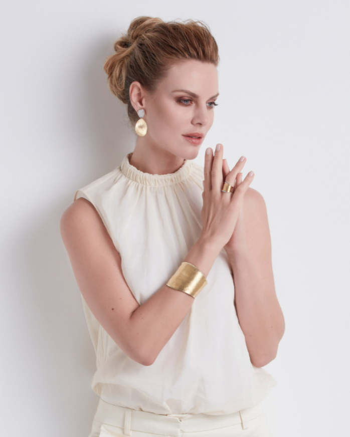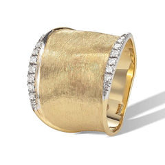 Questo anello a fascia, dai profili irregolari e dal design lineare, in oro giallo 18kt, è inciso a mano con l’antica tecnica del Bulino Millerighe e impreziosito da eleganti parentesi di Pavé di Diamanti taglio brillante.