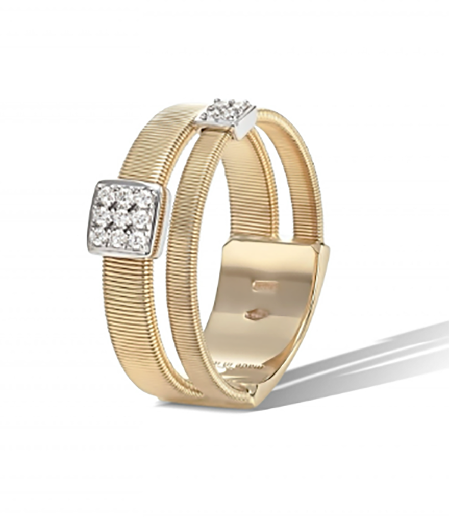 Due fili paralleli di spirali piatte, rispettivamente impreziositi da Pavé di Diamanti taglio brillante. Un anello in oro giallo 18kt dal look contemporaneo, e dall'eleganza senza tempo.