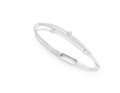 Tre fili di Spirale Piatta, intrecciati in un gioco di straordinaria lucentezza. Questo bracciale in oro bianco 18kt, monta tre Diamanti taglio Brillante e piastrina centrale con 23 Diamanti tagli Brillante.