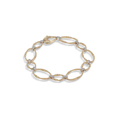 Questo bellissimo bracciale in oro giallo 18kt, è un girotondo di ovali in Spirale Ritorta uniti tra loro da sofisticati elementi in Pavé di Diamanti taglio brillante. Dall'eleganza discreta è un assoluto must have.