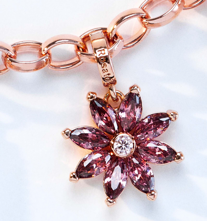 Charm STORIE argento 925/1000, galvanica oro rosa a forma di fiore e cz rodolite