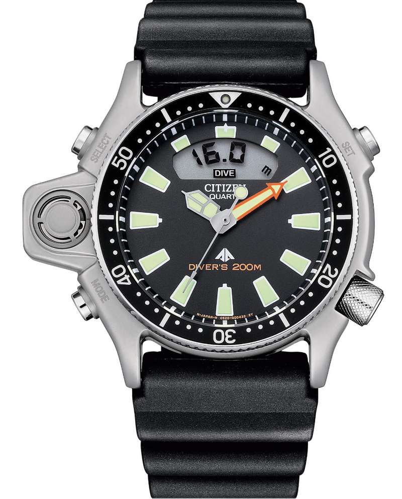 Orario (ore, minuti e secondi, AM/PM), calendario completo, suoneria, cronografo a 1/100 di sec., con rilevazione tempi parziali. Rilevazione dati di immersione e relativa memorizzazione. Allarmi di immersione. Controllo carica batteria. Sensore di profondità.