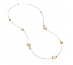 Collana lunga con catena irregolare e stations di foglie in oro 18kt, incise a mano con l'antica tecnica del Bulino Millerighe.