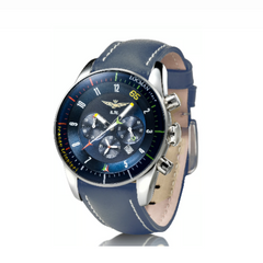 Un dettaglio distintivo è anche la sfera centrale dei secondi, a forma di freccia e impreziosita dai colori del Tricolore. Il quadrante blu sunray è racchiuso da un rehault con la minuteria, dove ai cinque minuti è riportato il numero 65, a celebrare la 65sima stagione acrobatica delle Frecce Tricolori. Al 12 campeggia l’Aquila Turrita, simbolo di tutti i piloti dell’Aeronautica Militare, e al 6 troviamo il logo della Pattuglia con le Tre Frecce, forti simboli di precisione e determinazione. L’ampio vetro curvo, su cui sono serigrafati gli indici dei secondi e la scritta Locman Italy, è fissato su una lunetta conica in acciaio satinato. L’ampia carrure lucida (44 mm), in acciaio inossidabile AISI e impermeabile fino a 10 Atmosfere, si caratterizza per una forma ergonomica, che ne ottimizza la vestibilità.