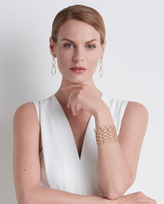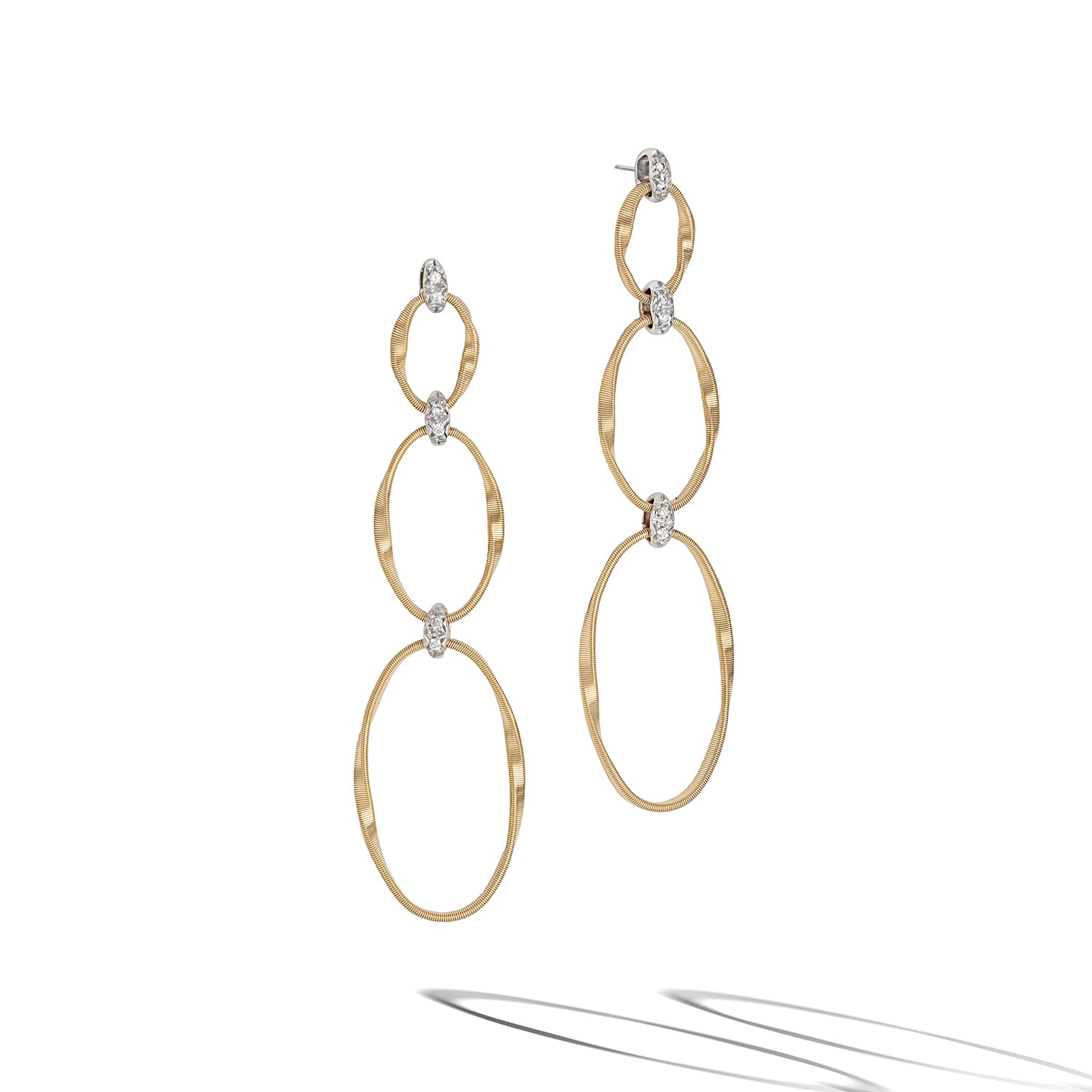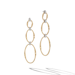 Un orecchino classico ed elegante. Questo gioiello in Oro giallo 18kt, monta un degradé di ovali in Spirale Ritorta, impreziositi da elementi in Pavé di Diamanti taglio brillante.