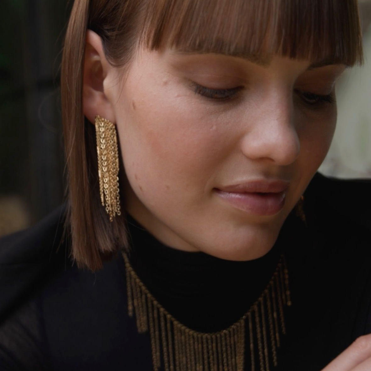 Orecchino a lobo singolo realizzato in argento 925 con galvanica oro giallo ad alto spessore e resistenza. L'orecchino presenta una cascata di catene. Lunghezza totale 6 cm.