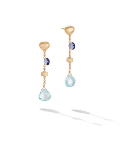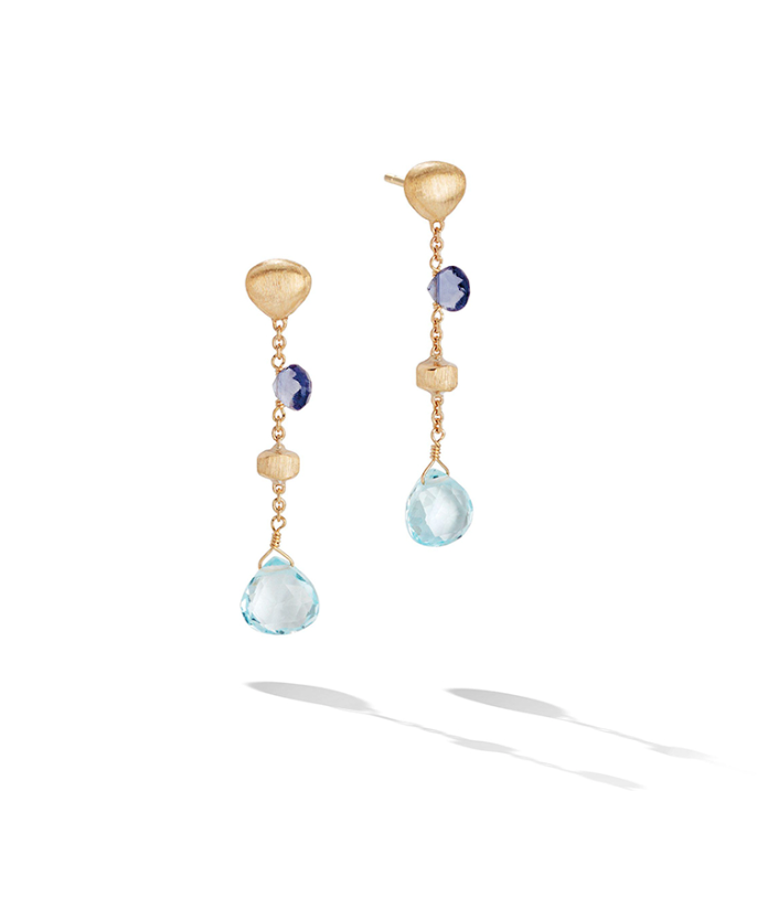 Leggero e ricercato, questo orecchino multicolore, con goccia di topazio azzurro dal caratteristico taglio a cuore, è un gioiello versatile e dall'eleganza discreta. Monta preziose pepite d'oro giallo 18kt, finemente incise a mano con l'antica tecnica del bulino millerighe.